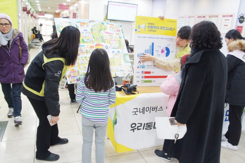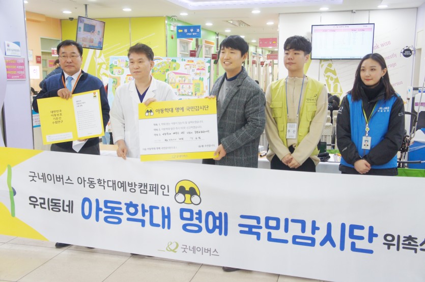 2018.12월 *아동학대예방캠페인* 페이지 정보 작성자 미즈아이 댓글 0건 조회 5,490회 작성일 18-12-10 18:14 목록 본문 2018.12.10(월) 본원에서는 굿네이버스 주최'아동학대예방캠페인'을 시행하였습니다.아동학대예방을 위하여 시민들을 대상으로 아동학대 실태 및 현황을 알리고전국민이 지역 내 아동학대예방을 위한 신고자 및 모니터링 하는 시민으로서 '국민감시단'이라는 역할을 부여하여'우리동네 아동학대 국민감시단이 되어주세요'라는 캠페인을 진행하였습니다. 아이들에게 적극적인 관심을 가지고사랑과 관심으로 아이들을 지켜주도록 우리 모두가 노력해야겠습니다. 앞으로도 아이들을 위해 최선을 다하는미즈아이병원이 되겠습니다. 이전글 2018.12월 *우수사원&우수팀 시상* 18.12.11 다음글 2018.11월 *내부 직원교육* 18.11.23 댓글 0 댓글목록 등록된 댓글이 없습니다.