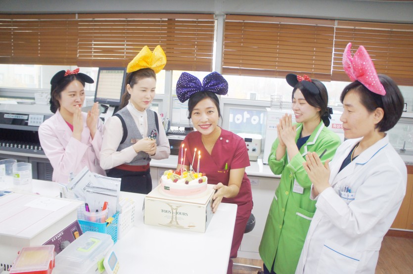 2018.11월 *생일자 파티* 페이지 정보 작성자 미즈아이 댓글 0건 조회 5,864회 작성일 18-11-16 15:14 목록 본문 2018.11.16(금요일)11월이 되면서 처음 맞이하는 절기가 바로 입동인 거 같은데요.날이 많이 쌀쌀해져서 정말 초겨울인 것 같은 느낌도 드는 것 같아요.겨울을 알리는 입동이 지났습니다.초겨울 날씨에 모두들 감기 조심하시구요~ 이번 달 11월의 생일자 파티 주인공은 진단검사의학과 정보람 팀장님 이십니다. 다들 웃는 모습이 너무나도 예쁘신 영상의학과와 진단검사의학과 선생님께서 함께 축하해주셨습니다. 수복이 쌓인 금빛 은행잎처럼직원분들의 11월도 금빛 행복으로 가득 채우시길 바랍니다.모두들 감기 조심하시고 건강한 11월 한달 보내시길 바랍니다~^^ 마지막으로11월 생일자 여러분 모두모두 진심으로 축하드립니다. 이전글 2018.11월 *장학증서 수여식* 18.11.21 다음글 2018.11월 *우수사원&우수팀 시상* 18.11.13 댓글 0 댓글목록 등록된 댓글이 없습니다.