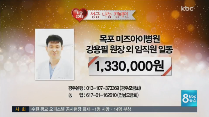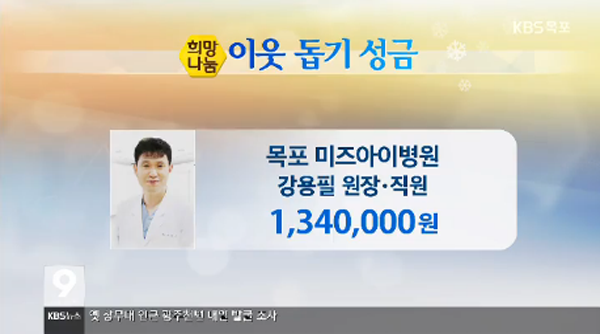 2017.12월 *불우이웃돕기 성금 기탁* 페이지 정보 작성자 미즈아이 댓글 0건 조회 6,739회 작성일 17-12-27 11:02 목록 본문 본원에서는 연말연시를 맞아 어려운 이웃과 소외계층에게 사랑과 희망을 주고온정이 넘치기를 바라며 희망 2018 성금 나눔 캠페인에 동참했습니다. 2017년 12월 25일 월요일 KBC 9시 뉴스 1,330,000원2017년 12월 26일 화요일 KBS 8시 뉴스 1,340,000원2017년 12월 28일 목요일 MBC 뉴스투데이 1,333,000원 원장과 임직원 일동 총 400만원을 기부하였습니다. 본원은 지역 복지 향상을 위해 노력할 것이며작은 온정으로 다가가 어려운 이웃과 소외계층에게 삶의 희망이 되기를 바랍니다. 이전글 2018.01월 *시무식* 18.01.02 다음글 2017.12월 *크리스마스 행사* 17.12.25 댓글 0 댓글목록 등록된 댓글이 없습니다.