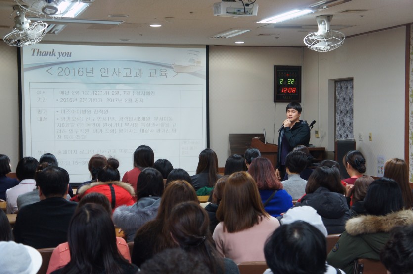 2017.02월 *인사고과교육* 페이지 정보 작성자 미즈아이 댓글 0건 조회 8,608회 작성일 17-02-23 10:07 목록 본문 2017년 02월 22일 수요일 전직원을 대상으로총무팀 박윤수 계장이 인사고과 교육을 실시하였습니다.12시와 15시 두 차례에 걸쳐인사고과 실시기간 및 실시방법, 평가방법, 필요성,그리고 개인정보보호법 등에 관하여 자세히 설명하는 시간을 가졌습니다. 아직은 쌀쌀한 겨울 바람 날씨에 건강 잃지 않도록 유의하시고항상 가정에 평안과 행복이 가득하시기를 바랍니다. 이전글 2017.02월 *12/01월 우수사원&우수팀 시상* 17.02.23 다음글 2017.02월 *생일자파티* 17.02.21 댓글 0 댓글목록 등록된 댓글이 없습니다.