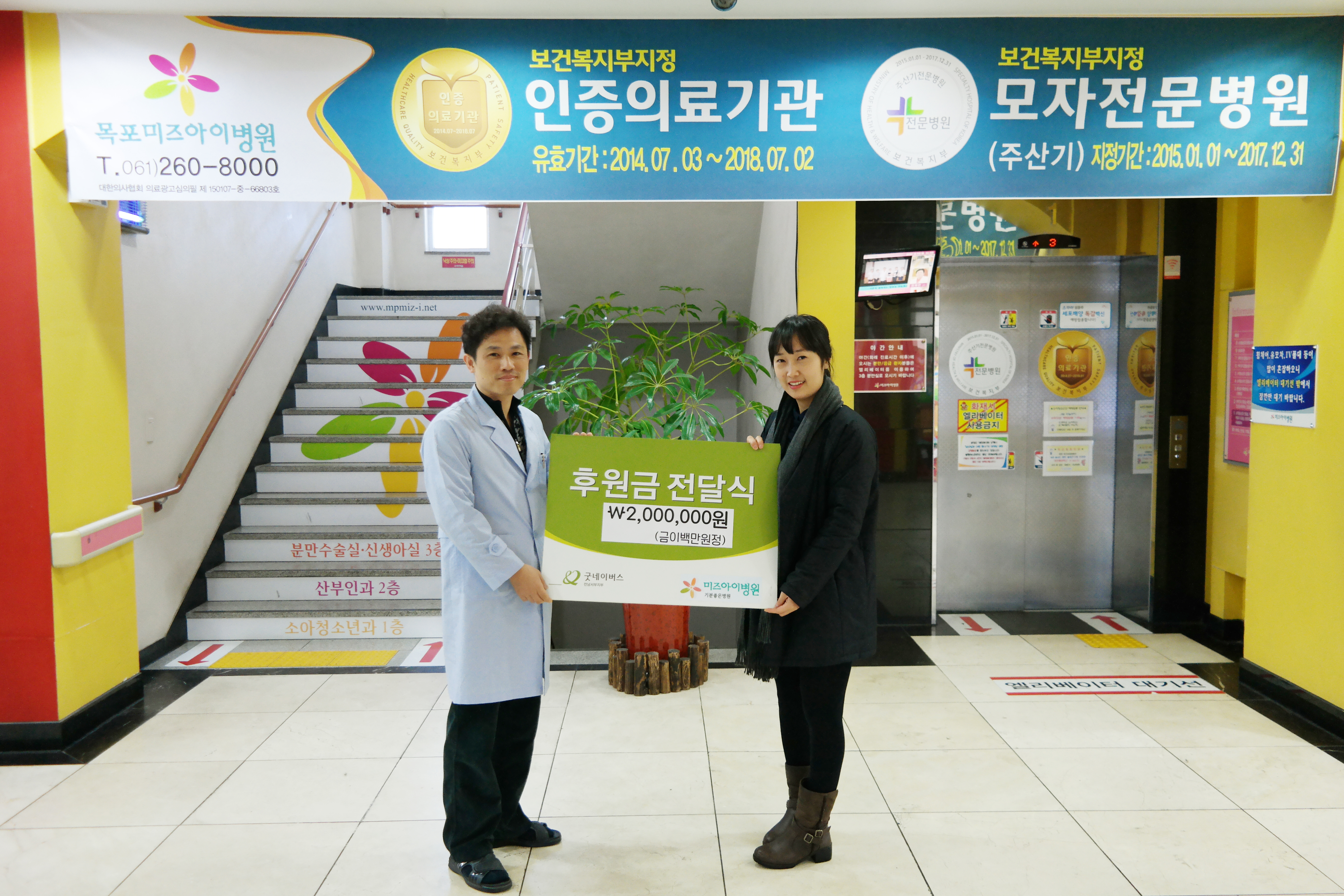 2016.01월 *아동보호 전문기관 '굿네이버스' 후원금 전달식* 페이지 정보 작성자 관리자 댓글 0건 조회 10,800회 작성일 16-01-26 15:35 목록 본문 2016년 1월 25일, 본원은 전남 서부권 아동보호 전문기관인 "굿네이 버스"를 통해 아동학대로 고통받는 아동들의 치료를 돕고자 소아청소년과 오관철 원장님이 따뜻한 나눔을 전달하였습니다.* 앞으로도 따뜻한 희망과 사랑을 실천하는 미즈아이병원이 되겠습니다.* 이전글 2016.02월 *전라남도' 장애인 거점 산부인과' 업무 협약식* 16.02.04 다음글 2016.01월 *생일자파티* 16.01.20 댓글 0 댓글목록 등록된 댓글이 없습니다.