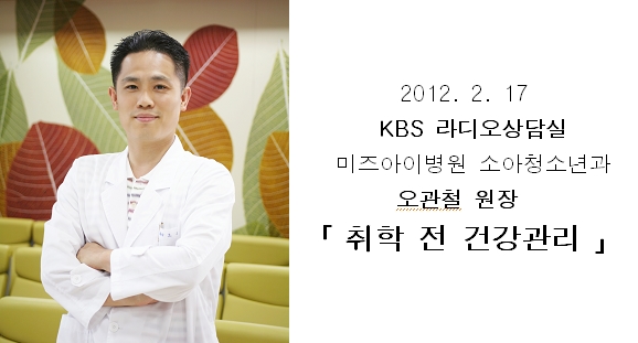 2012.02월 *오관철 원장 'KBS 라디오 상담실' 출연* 페이지 정보 작성자 관리자 댓글 0건 조회 12,507회 작성일 12-02-17 17:26 목록 본문 2012년 2월 17일 본원의 대표원장이신 오관철 소아청소년과 원장님께서'KBS 라디오 상담실'에 출연하여," 취학 전 건강관리 " 란 주제로 다음과 같은 궁금증에 대해 알려주셨습니다. 질문1) 취학 예비통지서를 받은 초보 부모님들의 마음 분주할텐데..,취학전 살펴볼 자녀들의 건강 리스트가 생각보다 많더라구요?? 우리 어린이들은 초등학교에 입학하면서 처음으로 대규모 단체생활을 경험하게 됩니다. 이 시기는 영유아 때 받은 예방접종의 면역력이 점차 감소하는 시기로 감염병 발생에 가장 취약한 시기이기도 합니다 취학아동은 본인의 건강은 물론 함께 공부하는 친구들의 안전을 위해 누락된 예방접종이 없는지 반드시 확인하고, 입학 전까지 예방접종을 완료하여야 합니다 또한 부모와 처음 떨어지는 아이들은 분리불안등을 체크해야 하며 그 외 기본적인 발육, 발달에 대한 검진이 필요하겠습니다. 질문2) 구체적인 내용 살피기 전에,'취학 전 건강체크'에 대한 다양한 궁금증 시민들께 들어봤습니다. 질문2-1.취학 전에 꼭 해야 하는 예방접종 아이가 이번에 초등학교에 입학을 하는데요.요즘은 입학전에 꼭 해야하는 예방접종들이 있다 그러더라구요.어떤 걸 해야 하는지 궁금합니다. 지금은 국가 차원에서 모든 취학 아동에 대해 DTP 5차/소아마비4차 MMR 2차 일본뇌염의경우 사백신은 4차 생백신은 3차등을 확인하도록 하고 있습니다. 질문2-2.취학 전에 하면 좋은 검사들. 텔레비전을 볼 때나 뭘 볼 때 자꾸 눈을 찡그리고 보는 거예요.그래서 시력이 나쁜 건가 싶어서 안과검사를 받아 보려고 하는데요,이거 말고도 혹시 아이들이 입학하기 전에 받아보면 좋을 검사가 있을까요? 시력의 발달이 성인 수준으로 이루어지는 시기가 5-7세입니다. 양친 부모가 다 안경을 쓰셨을때 아이도 안경을 쓸 확률도 아주 많습니다. 특히 부모가 모두 안경을 쓰셨다면 학교가기전에 꼭 안과 검사를 해보시는것이 좋겠습니다. 질문2-3.ADHD증후군 남자아인데요, 지나치게 활동적인건지 잠시도 가만히 있지를 않아요.가끔은 우리 아이가 혹시 ADHD증후군은 아닐까 하는 생각도 들고,에이 설마, 하면서도 걱정이 되는데 이 ADHD증후군은 정확히 어떻게 알 수 있죠? 2-4세 아이들은 원래 많은 움직임을 보일수 있습니다. 주의력결핍과잉행동장애증후군이 문제시되는 것은 대게 아동이 유치원이나 학교에 들어간 후입니다. 가장 확실한 방법은 정신과전문의의 임상적평가와 심리검사를 통해 진단할수 있으며 심리,행동치료와 약물치료가 가능하며 적절한 치료를 받으면 예후는 좋습니다. 가장중요한 것은 원래 과잉 운동을 나타내는 나이에 따른 적절한 과잉 운동과 구별해야 하는것입니다. 질문2-4.소아비만 우리애는 딸인데, 이번에 초등학교에 들어가거든요.근데 또래 애들보다 몸무게가 한 8kg정도 더 살이 쪘어요.배도 많이 나오고. 평소에도 굉장히 잘 먹는데 나중에 키로 간다고 그냥 뒀었는데 살이 너무 찌니까 소아비만이 될까봐 걱정이돼요.한창 크는 애라 못먹게 할 수도 없고...어떻게 해야하죠? 서구적 식습관으로의 변화, 과외활동과 컴퓨터 사용의 증가로 운동량의 감소등이 주원인이 되어 소아비만이 엄청난 속도로 늘어가고 있습니다. 일단 가장 중요한 것은 부모님들부터 소아비만의 심각성에 대해 인식을 하시는 것이 좋습니다. 성인비만으로의 이행율도 높구요 어려서부터 계속 비만인체로 장기간 자라게 된다면 심각한 성인병에 노출될수 있다는것을 아셔야 합니다. 또한 한 보고에 의하면 부모가 비만이면 자식이 비만일 확률이 80% 부모중 한분이 비만이면 40%에서 아이가 비만이 생긴다고 합니다. 부모님들부터 심각성을 인지하시고 올바른 진단과 치료를 서둘러야 합니다. 질문 2-5.설소대 수술 저희 아이는 혀가 좀 짧아요. 혀를 내밀면 하트 모양이 되고,그래서 발음도 좀 부정확하고.학교 들어가서까지 혀 짧은 발음을 하면 놀림 받을까봐 걱정돼서 병원갔더니 설소대 수술을 하라 권하시던데, 이 수술을 하고 나면 발음이 정상적으로 될까요? 대게는 혀를 입술밖으로 원활하게 내밀수 있으면 괜찮다고 합니다. 혀를 내밀대 설소대에 의해 심각한 방해를 받는다면 말을 배우기전인 돌이전에 대게는 시술을 하게 됩니다. 외래에서 5분 이내로 간단히 할수 있습니다. 학동기 전기 아동이 계속 혀 짧은 발음을 한다면 이미 어느정도 기간이 지나서 습관처럼 된경우도 있고 또한 그 외의 다른 이유도 있기때문에 정식으로 진단받아 봐야 합니다. 수술이외에 발음교정등의 언어치료가 필요한 경우도 있겠습니다. 질문3 이밖에 필요한 건강 체크 사항은 어떤 것이 있구요..자녀들의 새학기 적응을 위해 가정에서 반드시 지켜줘야 할 사항이 있다면 소개해 주시죠. * 규칙적인 식습관을 들이고 편식을 없애도록 교육한다. * 배변 습관을 확인하고 미숙한 점이 있다면 교정한다. * 취침시간을 일정하게 해 충분한 수면을 취하도록 한다. * 양치질 습관을 들인다. 특히 잠자기 전 양치질 잊지 말도록. * TV시청과 