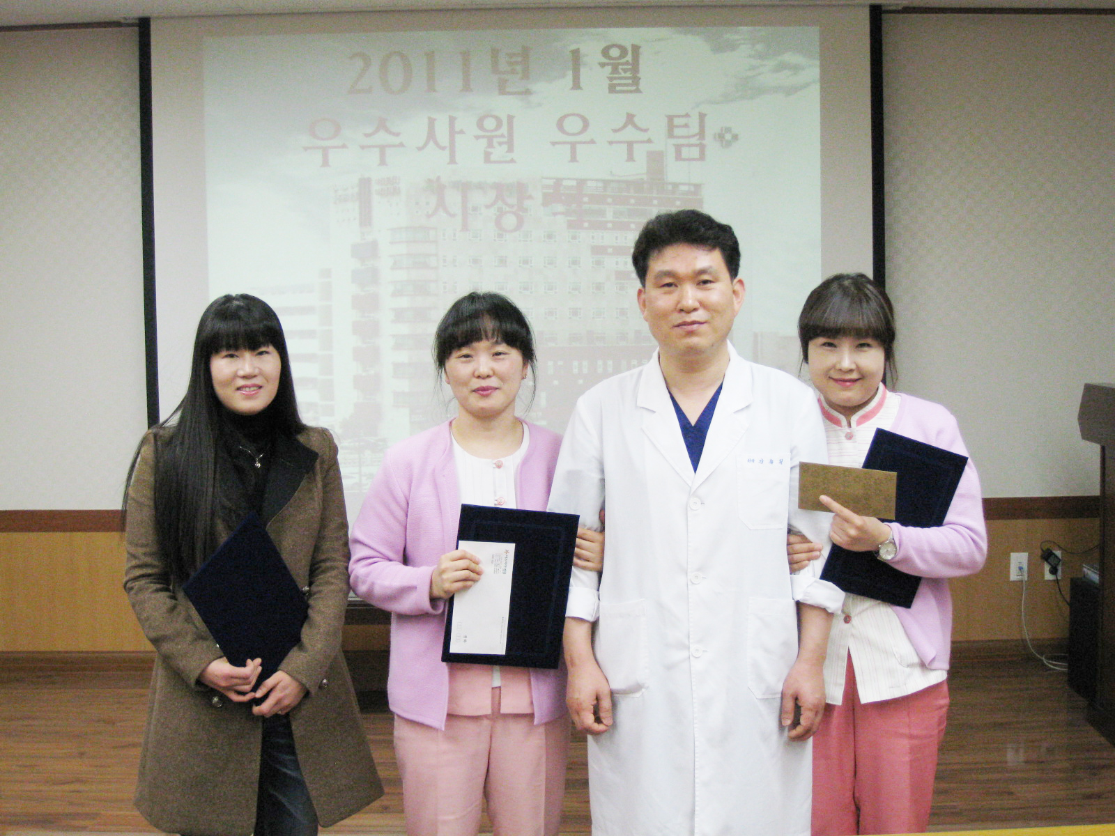 2011.02월 *01월 우수사원&우수팀 시상* 페이지 정보 작성자 관리자 댓글 0건 조회 12,244회 작성일 11-02-19 09:39 목록 본문 2011년 2월 17일(목) 강용필 원장님을 모시고,1월 우수사원 및 우수팀 시상식을 갖었습니다.우수팀은 어린 신생아부터 청소년까지 건강을 진료해주는소아청소년과 외래1팀이 선정되었으며,우수사원은 산부인과 외래2팀의 오선영선생님과소아청소년과 4병동팀의 안하영선생님이 선정되었습니다.*고객에게 더 나은 서비스로 다가가기 위해 미즈아이는 멈추지 않고 노력하겠습니다.* 이전글 2011.02월 *목포MBC 임신육아교실* 11.02.24 다음글 2011.02월 *미즈아이 주변환경 가꾸기* 11.02.17 댓글 0 댓글목록 등록된 댓글이 없습니다.