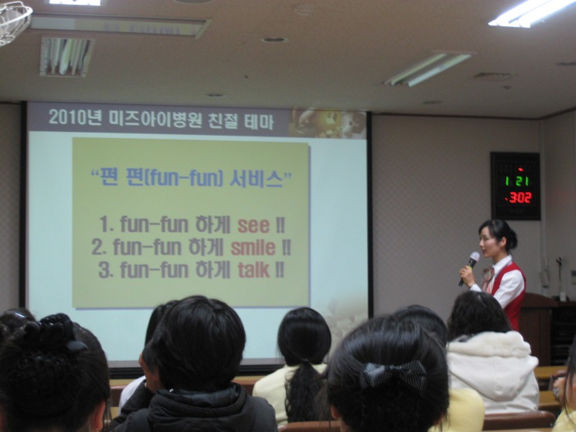 2010.01월 *전직원 친절교육* 페이지 정보 작성자 관리자 댓글 0건 조회 12,687회 작성일 10-01-21 18:29 목록 본문 - 2010년 미즈아이병원 친절테마 - "FUN-FUN 서비스"1. fun-fun하게 see!! 2. fun-fun하게 smile!!3. fun-fun하게 talk!!이번 교육은 신년을 맞이하여 "2010년 미즈아이병원의 친절테마" 주제를 가지고,서비스 코디네이터 서묘경,김현진 선생님이 전직원 친절교육을 실시하였습니다.올 한해에도 "FUN-FUN 서비스"로 즐겁게 일할 수 있는 행복한 병원문화를 만들어 고객에게 따뜻한 미소로 친절과 감동을줄 수 있도록 미즈아이병원은 더욱 더 노력하겠습니다. 이전글 2010.01월 *볼링 동호회 굴리지오 모임* 10.01.26 다음글 2010.01월 *등산 동호회 오르지오 '제주도 한라산'* 10.01.18 댓글 0 댓글목록 등록된 댓글이 없습니다.