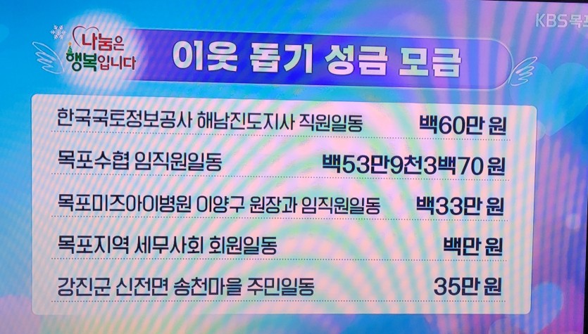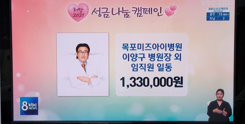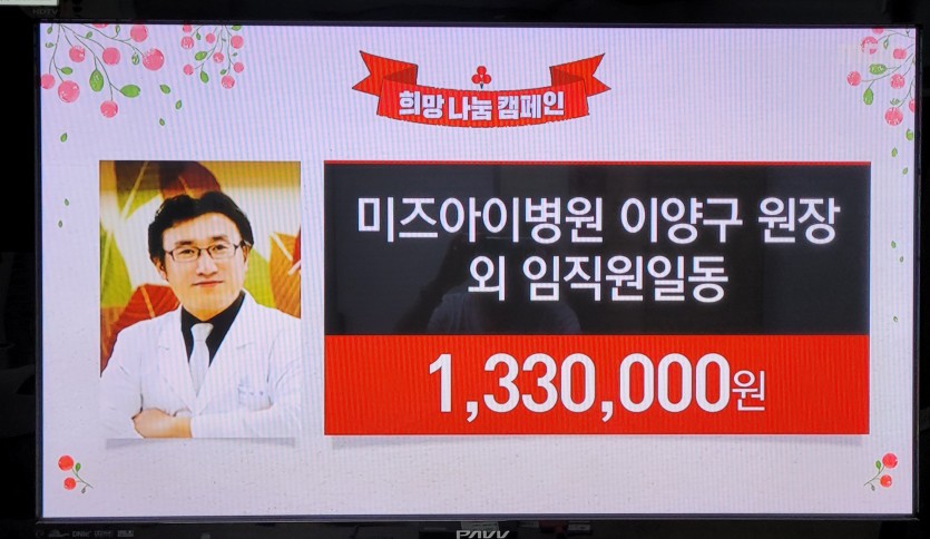 2020.12월 불우이웃돕기 성금 기탁 페이지 정보 작성자 미즈아이 댓글 0건 조회 3,822회 작성일 20-12-25 09:56 목록 본문 본원에서는 연말연시를 맞아 코로나로 더욱 어려워진 이웃과 소외계층에게 사랑과 희망을 주고온정이 넘치기를 바라며 3사 희망 성금 나눔 캠페인에 동참했습니다. 2020년 12월 24일 목요일 KBS 7시 뉴스 1,330,000원 2020년 12월 24일 목요일 MBC 8시 뉴스 1,330,000원 2020년 12월 24일 목요일 KBC 8시 뉴스 1,330,000원 원장과 임직원 일동으로 기부하였습니다. 본원은 코로나로 인해 어려운 상황이지만 지역 복지 향상을 위해 노력할 것이며 지속적인 사랑나눔을 실천하는 미즈아이병원이 되도록 노력하고 있습니다. 힘들지만 마음은 따뜻한 연말 보내시기 바랍니다. 이전글 2020.12월 우수사원&우수팀 시상 21.01.12 다음글 2020.12월 생일자파티 20.12.21 댓글 0 댓글목록 등록된 댓글이 없습니다.